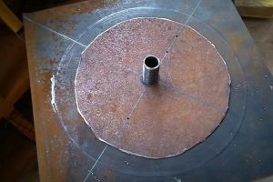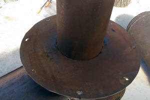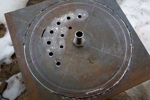 По поставленному самому себе мастером техническому заданию, конструкция печи предполагает возможность разборки — для проведения профилактических работ или для транспортировки прибора в другое место эксплуатации. Поэтому и соединение двух баллонов сделано разборным — по фланцевому принципу. Роль фланцев играют две пластины одинакового внешнего диаметра – 360 мм, вырезанные из стального листа толщиной 4 мм.