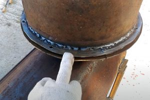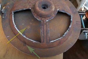 Однако после сварки оба листа едва заметно повело, но этого хватило для появления небольших щелей. Поэтому при сборке пришлось по нижней пластине выложить в две окружности асбестовый шнур, а затем обжать оба фланца болтами.