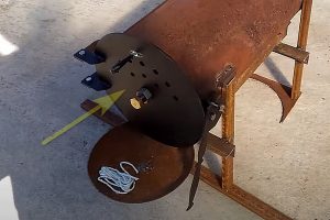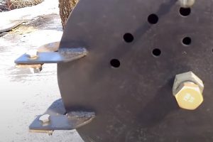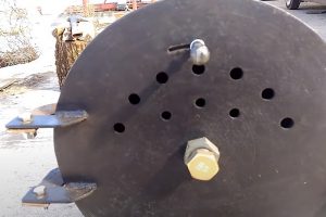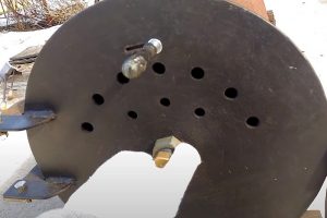 Вход в камеру сгорания №1 закрыт крышкой диаметром 360 мм, также врезанной из пластины 4 мм (поз. 9). Но это – только видимая часть. С противоположной стороны к этой пластине прилегает срезанный колпак баллона с горловиной (поз. 10). Это прилегание обеспечивается расположенной по центру трубой 25 мм (поз. 11), выполняющей роль стяжной шпильки – детали поджимаются сантехническими гайками (поз.12). Специфическая форма внутренней части люка в сборе, то есть верхушка баллона, обеспечивает очень плотное, практически герметичное закрытие камеры. Понятно, что здесь щелей по периметру, как в прошлом примере, оставлять нельзя, иначе схема просто не будет работать.