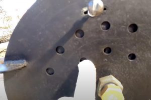 Затем простым переносом по маленьким дыркам намечаются центры отверстий и на тонкой пластине. После этого проходятся уже большим сверлом (100 мм – по 7 отверстий во внешних рядах, и 8 мм по 3 отверстия во внутренних).