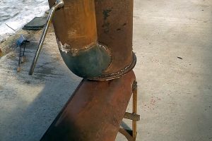 При изготовлении верхней камеры со второго баллона также срезался колпак с горловиной. Чтобы использовать его полезно, из него сделан съемный зольник в виде «блюда», позволяющий проводить чистку камеры.