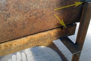 В данном проекте сделаны четыре ножки их профильной трубы 40×20. Ножки попарно (передняя и задняя пары) соединены перемычками из уголка. А объединяющей обе пары ножек деталью становится станина из швеллера, приваренная к перемычкам-уголкам.
