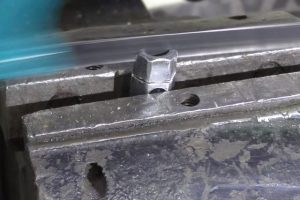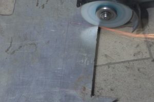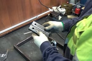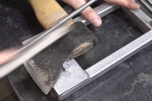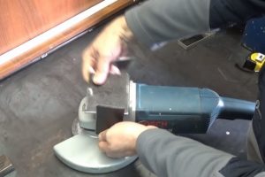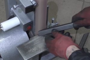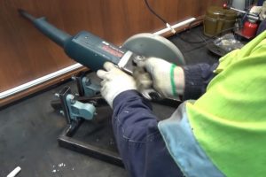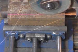 Потом он зажимается в тиски, чтобы ровно срезать шлифмашинкой одну полку.