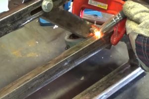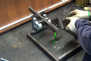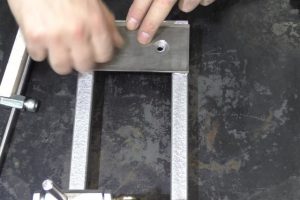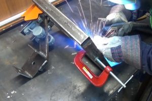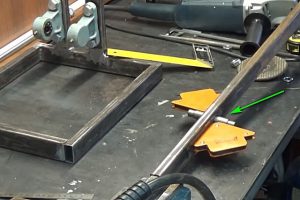 Следующий шаг – к трубе струбциной прижимается сваренный ранее кронштейн для крепления шлифмашинки – так, как показано на иллюстрации.