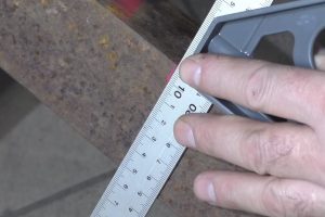 Можно ее изготовить из толстой стальной пластины. Но мастер решил придать ей небольшой обратный уклон, поэтому вырезает ее из уголка с полкой 63 мм.