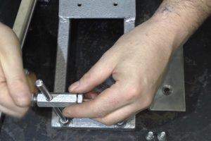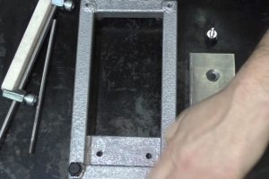 После этого фиксаторы надеваются на штангу. Между ними в вырезанные четверти укладывается точильный брусок, и вся эта сборка фиксируется прижимными болтами.