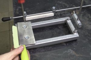 Еще один вариант – это отметки на вертикальной стойке. Правда, в этом случае требуется единообразие в размещении ножей в струбцине – чтобы режущая кромка выступала всегда на одном расстоянии от края. Не вполне удобно.