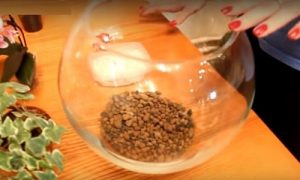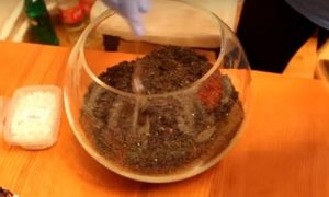 Так как этот песок играет исключительно декоративную роль, нет никакого смысла рассыпать его по всей поверхности грунта – только по периметру, где его слой будет виден через прозрачные стенки флорариума.