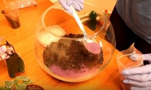Однако если в состав мини-сада будут входить цветы с явно непродолжительным периодом цветения, то их стоит установить во флорариум прямо в «родных» горшках, прикопав их в субстрат, а затем накрыв декоративным слоем. В этом случае отцветшее и потерявшее декоративную ценность растение легко можно будет заменить впоследствии на другой цветок, не повредив корни рядом расположенных соседей.