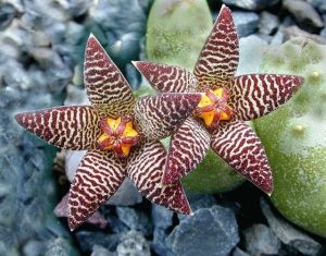 Аргиродерма (Argyroderma), Конофитум (Conophytum) и Литопс (Lithops) схожи между собой по своему строению. Их листья имеют форму, напоминающую грецкий орех, за что они образное название «живые камни». Когда начинается цветение, части «ореха» раскрываются, и между ними прорастает короткий стебель с бутоном на его конце.