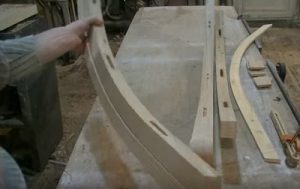 Мастер решил укрепить гнутоклееные заготовки деревянными накладками, которые скрепляются между собой шкантами. Накладки размечаются и выпиливаются по шаблону, создаваемому уже по внутренней стороне гнутоклееных заготовок.