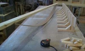 Установка промазанной клеем заготовки на стапели производится от центра, то есть сначала струбциной притягивается середина, затем зацепляются, но не притягиваются окончательно края ламели. После чего, начиная от середины с шагом в 100 мм, устанавливаются и затягиваются через деревянные подкладки струбцины, создавая нужный радиус будущего полоза.