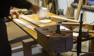 После раскроя деталей их складывают вместе, сжимают в струбцинах, и при идеально подгоняют друг к другу с помощью лобзика и фрезера.
