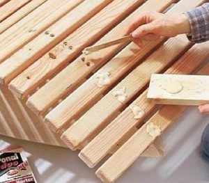Головки крепежа также утапливаются в древесину и заделываются шпаклевкой, после чего накладки отшлифовываются.