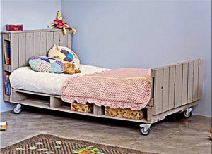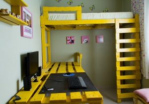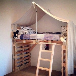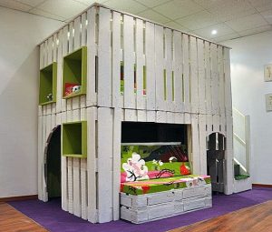 Детская комната тоже может быть обустроена мебелью, сделанной из поддонов. Тем более что такой материал предоставляют широкие возможности для проявления своих творческих способностей. Кроме того, учитывая доступную стоимость материала, можно его не особо экономить, выстраивая большие по размерам конструкции.