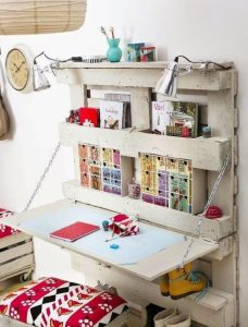 Еще один многофункциональный предмет мебели для детской комнаты, изготовленный из паллет — это полка с раскладным столом.