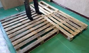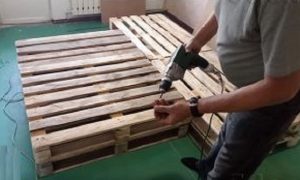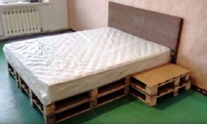 В качестве примера можно рассмотреть изготовление из поддонов двуспальной кровати. Эта модель подойдет для тех мастеров, которые не имеют желания разбирать паллеты и составлять из них модули меньшего размера.
