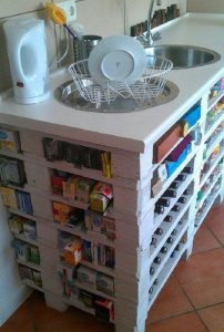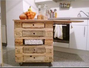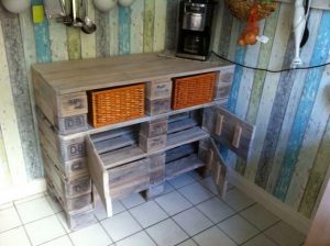 Не обошли своим вниманием мастера и кухню, применив свои творческие способности для изготовления различных предметов мебели из грузовых поддонов. Тем более что конструкция паллет позволяет без затруднений создать большое количество полок, так необходимых для хранения кухонных принадлежностей.