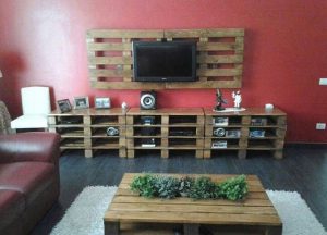 Еще один вариант мебельного комплекта для гостиной, изготовленного из паллет, состоит из специально предназначенного для закрепления телевизора стенда, открытых тумб и журнального столика.