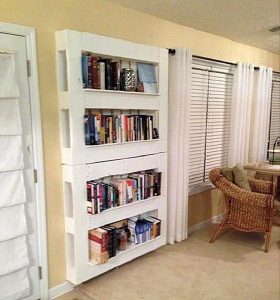 Использование поддонов для постройки книжного шкафа является отличным решением, так как они уже представляют собой готовый каркас с идеальными размерами под обустройство вместительных полок.