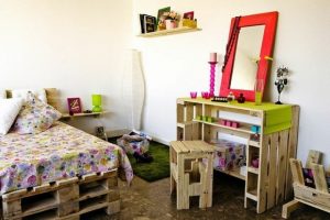 В этом интерьере – целый спальный гарнитур: из паллет изготовлена не только кровать, но и туалетный столик, а также табурет, идущий в комплект к нему. Кроме этого, из того же материала сделаны и мелкие предметы интерьера.
