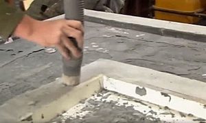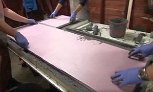 Существуют и другие способы изготовления бетонных столешниц с полным заполнением опалубки бетонным раствором. В этом случае стекловолокна для укрепления плиты будет недостаточно, поэтому для армирования используется металлическая сетка.