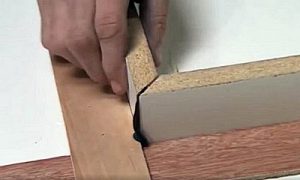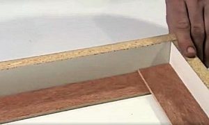 - Далее, на торцы фанерного основания приклеиваются кромочные полоски. При этом на срезы, сделанные под углом в 45 градусов, клей наносится отдельно. Затем производится стыковка резов кромки и горизонтальной панели, в результате чего образуется прямой угол.