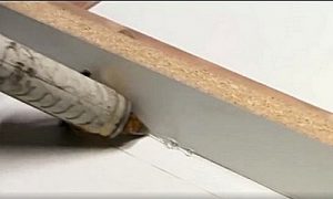 - Затем, подготовленный бортик приклеивается к задней торцевой части столешницы и также прижимается струбцинами до полного высыхания клея. После чего, излишек клеевой массы аккуратно счищается стамеской.