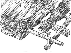 Маты из снопов сделать самостоятельно — достаточно просто. Для этого потребуется сбитая из досок рама, труба-перекладина (турник) или даже надежная ветка дерева, растущая практически горизонтально. Кроме того, необходима прочная веревка или проволока, которая должна иметь длину равную двум значениям высоты от земли до перекладины. Каждый из отрезков веревки складывается пополам, и в этом месте завязывается крепкий узел. Один конец веревки привязывается к верхней перекладине, а второй остается на земле. Чтобы было работать более удобно, на свободные концы закрепляются небольшие заточенные куски реек или специальные приспособления – челноки.