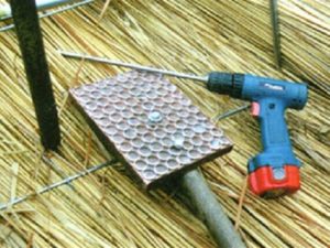 Эти крепежные элементы извлекаются по мере того, как ряд будет закреплен к основе проволокой. Затем их переставляются на следующий укладываемый слой камыша, и они остаются на месте также до его окончательного закрепления. Таким образом, в среднем, для работы потребуется 25÷30 штук таких крюков или зажимов.