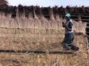 - Для того чтобы края кровли получались полными и красивыми, для них часто вяжутся так называемые двойные снопы. Чтобы его изготовить, сначала вяжется одинарный сноп, но его не стягивают свяслом очень туго. Затем готовый тюк укладывают на землю и прижимают коленом — он от такой нагрузки становится плоским. Далее, камыш разделяют на две примерно одинаковые части, после чего одну из них поворачивают на 180 градусов, так, чтобы метелки оказались в разных направлениях. Потом делается еще один поворот на 180 градусов, при котором метелки оказываются снова рядом. Так получается два снопа, соединенных между собой одним жгутом.