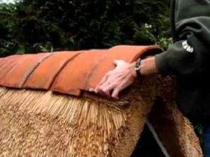 Другой вариант формирования конька — это укладка тюков строевого камыша вдоль него и закрепление их к обрешетке, а затем покрытие их увязанной из стеблей «шапкой».