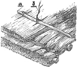 - Отдельно нужно выделить так называемый «старорусский» способ укладки камышовых снопов. В нем на стропильные ноги конструкции закрепляются слеги — горизонтально уложенные тонкие бревна или толстые ветки. На них укладывают и прижимают жердями (притугами) камыш, скомпонованный в снопы. Притуги ранее привязывали к слегам ивовыми прутьями, но сегодня вместо них обычно используется прочная, гибкая проволока. Камыш в тюках укладывался ступенями, а затем подбивался гребенками.