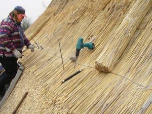 - На краях слег обрешетки снопы камыша нужно обязательно дополнительно прошивать нержавеющей проволокой толщиной в 1 мм, которую необходимо размещать через каждые 200 мм.