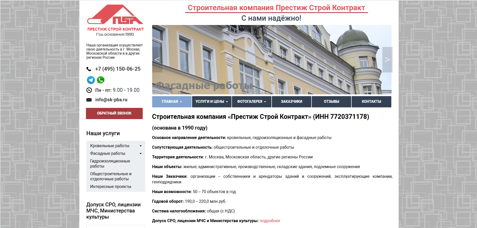 Компания «Престиж Строй Контракт» работает на строительном рынке с 1991 года и специализируется на ремонте кровли и фасадов крупных объектов площадью от 300 м². За десятилетия успешной деятельности компания заслужила репутацию надежного подрядчика, которому доверяют как частные заказчики, так и организации.