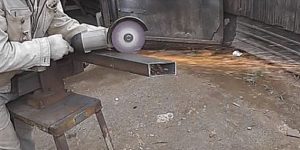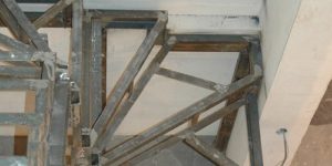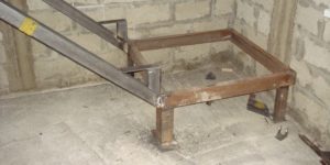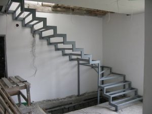 - Для массивных лестниц обычно выбирается более надежный вариант металлических конструкций, состоящий из прямых косоуров, на которые навариваются каркасы для ступеней. Для их основы используется труба 80×60 или 100×50 мм, а для изготовления каркаса под ступени — профиль 25×25 мм или даже уголок с полками того же размер, что дает определённую экономию в затратах на металл. В нижней и верхней части каркаса сваркой фиксируются подставки, вырезанные из металлического листа.