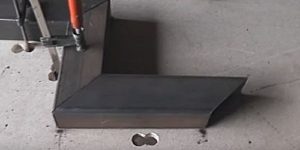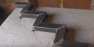 Ломаный косоур более сложен в изготовлении, так как собирается из отдельных отрезков трубы, обрезанных под правильным углом, которые соединяются между собой в общую деталь с помощью сварки. Затем, на каждой из горизонтальных поверхностей косоура приваривается так называемая «подошва» (монтажная площадка), изготовленная из листового металла толщиной в 3÷4 мм. На этой «подошве» будут закреплены доски проступей. Для их фиксации в металлических пластинах заранее просверливаются четыре — шесть отверстий. Через них в древесину будут вкручены саморезы. Для этой конструкции вполне может подойти профильная труба с размером в сечении 80×60 мм.