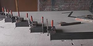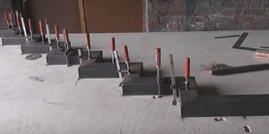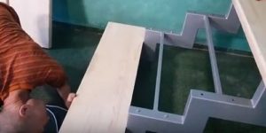 На трубе-косоуре производится разметка, по которой будут приварены подставки под установку поступей. Подставки состоят из ножки, также из отрезка профильной трубы, со срезанными под нужным углом (в зависимости от крутизны лестничного марша) торцами, на которую привариваются «подошвы» с отверстиями для фиксации на них досок проступей.