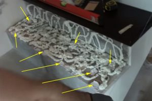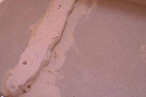 Слой герметика аккуратно наносится в паз с помощью шприца, с таким расчетом, чтобы при соединении не получилось слишком много выдавленных излишков (а лучше вообще их избежать).