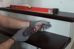 Верхняя проступь (темного цвета) уже зафиксирована, и подступенок устанавливается снизу и расклинивается до упора в нее по всей линии соприкосновения. При этом одновременно уровнем выверяется его вертикальное положение.