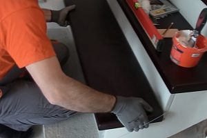 После этого деревянная панель устанавливается на свое место, так, чтобы паз идущий с тыльной стороны вдоль свеса проступи и промазанный герметиком — наделся на подступенок нижней ступени.