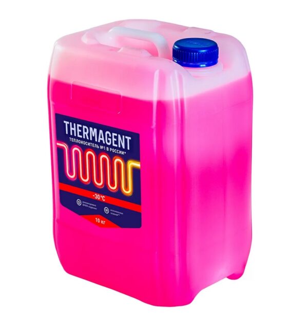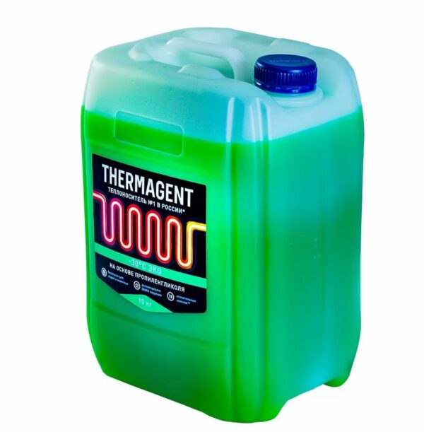 Этиленгликоль, который используется для изготовления антифризов, представляет собой прозрачную маслянистую жидкость без запаха. Это двухатомный спирт, для которого характерна устойчивость к замерзанию при минусовых температурах. Технология производства термагентов предусматривает разбавление этиленгликоля водой для получения состава с заданной температурой начала кристаллизации, а также добавление карбоксилатного пакета многофункциональных присадок. Этиленгликоль токсичен, поэтому термагенты на его основе рекомендованы к применению в системах, где вероятность соприкосновения человека с антифризом минимальна. Хорошим выбором для отопительной системы может быть теплоноситель Thermagent -65 ˚C на основе высококачественного очищенного этиленгликоля. Антифриз создавался для использования в качестве рабочей жидкости закрытых систем отопления жилых и производственных зданий, систем охлаждения производственного оборудования, чиллеров, холодильных агрегатов и т. д.