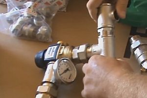 И в завершение публикации – еще один наглядный пример самостоятельной сборки несложного смесительного узла для системы «теплого пола». Примечательно то, что мастер комбинирует две технологии монтажа – резьбовые соединения металлических элементов и паянные — из полипропиленовых деталей.
