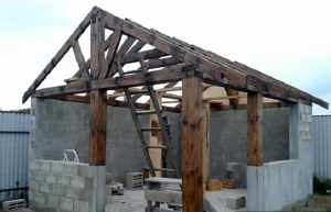 - Следующим шагом на углы деревянной обвязки устанавливаются стропильные ноги, которые подпиливаются и соединяются в одной верхней точке. Для их фиксации между собой можно использовать металлический крепеж.