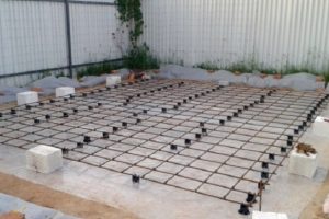— Чтобы вода из бетона поле заливки не ушла в грунт, снизив тем самым качество созревания, прокладывается слой гидроизоляции – полиэтиленовой пленки или самого недорогого рубероида.