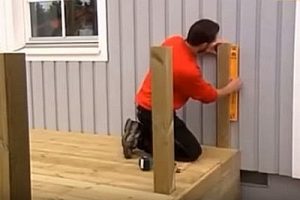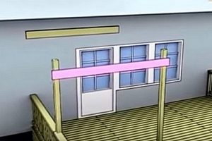 К стене дома закрепляется брус или доска толщиной не менее 50 мм, такой же высоты, что и остальные стойки ограждения.