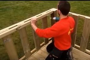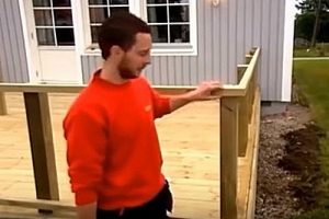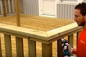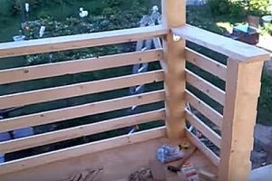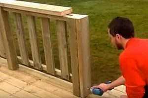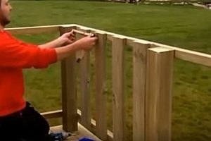 Следующим этапом идет монтаж ограждающей конструкции. Общая высота ее в показываемом примере составляет 900 мм, 50 мм из которых — это перекрывающая доска — перила.