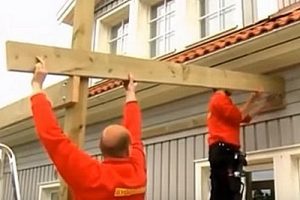 Следующим шагом рама поднимается, выставляется и временно прикручивается к доскам, предназначенным для ее крепления.