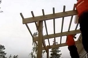 Каркас состоит из четырех стоек, которые изготавливаются из бруса 150×150 мм. Длина (высота) бруса подбирается в зависимости от высоты стены дома, так, чтобы крыша веранды была расположена под углом, то есть формируется односкатная крыша с уклоном в 15÷20 градусов.