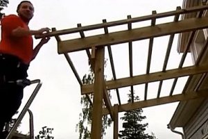 Следующим шагом горизонтальной доской толщиной в 50 и шириной в 150 мм, связываются внешние стойки будущего козырька.